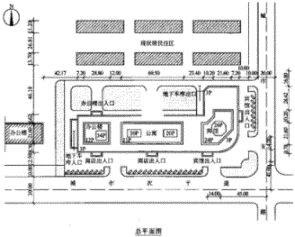 | 2.某城市擬在市中心地段新建一座集公寓、辦公、賓館、商業為一體的綜合性建筑,用地朝向為南偏東13°,用地情況如下。 1.東側為城市支路,道路紅線寬度20m,退紅線設10m寬綠帶。 2.南側為城市次干道,道路紅線寬度30m,退紅線設15m寬綠帶。 3.北側為現狀居民區,全部為6層磚混住宅。 4.西側為現狀辦公樓。 城鄉規劃部門提供的規劃設計條件如下。 1.低層、多層建筑退綠線不少于5m。 2.高層建筑退綠線不少于15m。 3.建筑高度100m。 4.綠地率不少于15%。 5.停車車位:按照規范要求。 6.日照要求:板式建筑間距系數為1.51,塔式建筑間距為遮擋面面寬的1.2倍。設計單位提供的圖紙詳見附圖。 請按照我國相關規定及規劃管理部門的規劃設計條件提出設計圖紙中存在的問題。 ![]() ![]() |