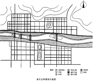 | 3.下圖為某市市區總體規劃示意圖。該市位于我國中部丘陵地區,為人口規模約70萬的大城市,某河流該市將分為南北兩個組團,其中南組團為城市中心區,北組團為城市新區,重點是教育科研產業。河流兩岸有大片濱河綠地,河流中有一小島(D),為省級風景名勝區。 試評析道路網結構的不合理之處。 ![]() |