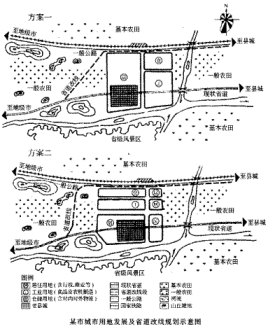 | 1.圖為某縣級市城市用地發展布局和省道改線的兩個方案。值得注意的是該市西距人口65萬的地級市40km,東距人口5萬的縣城30km,用地條件較好,西部為山丘坡地,東部較為平坦,水資源充沛。雖現狀人口不足10萬,但近些年國家鐵路通車后,社會經濟快速發展,省域城鎮體系規劃中已確定其為重點發展城市。 試評析,哪一個方案對城市今后的發展更為有利?說明理由。 (注:不考慮人口規模預測及各項用地比例。) ![]() |