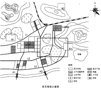 | 3.某地級市總體規劃確定,主城區在現狀基礎上仍分為5個組團,該市地勢西北高、東南低,有3條河流,主導風向東北風,主城區現狀常住人口60萬人,規劃為90萬人(見現狀圖和規劃示意圖)。 規劃要點如下。 1.城市性質:省城北部區域中心城市,新型工業基地。 2.總體布局:為"二主三副"的組合型布局結構,"二主"為A、E組團,"三副"即B、C、D功能組團,各組團之間保留農田和生態綠地進行分隔。 3.道路交通:增建高速公路出入口 ,規劃連接各組團的城市快速路系統。4.工業布局:規劃4處工業區,在A組團安排機械制造和生物制藥園區,C組團安排新型建材及水泥廠,E組團為電子信息高新技術園區,D組團安排物流中心。 5.在組團隔離帶內留出高壓電力線走廊,新規劃1個水廠,4個污水處理廠。 試指出上述規劃中不合理之處,并簡要說明理由。 ![]() ![]() |