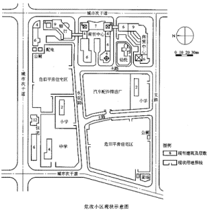 | 2.某城市小區,三面臨城市干道,其南側為支路。總用地為14.5公頃。現狀市政管線已埋入道路地下,已建配電房能滿足小區改建后要求。該區用地東側已建成金融、商業服務中心;小區西北角有兩幢新建住宅樓和一所中學;另有兩所小學、一處幼托,以及兩片危舊平房住宅區和一處汽車配件鑄造廠。現已決定將此小區列為危改居住小區進行統一規劃。 試根據現狀條件(見示意圖)及一般危改居住小區的規劃設計要求,提出需要調整和增加的主要內容。 ![]() |