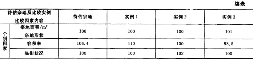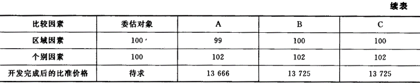 | 3.下面是一份土地估價技術(shù)報告的市場比較法測算說明部分 (標注"略"的為正常內(nèi)容)。請閱讀后回答相關(guān)問題(答案寫在題目下方空白處)。 假設(shè)用開發(fā)法求取委估地塊綜合用途地價。 1.本次評估假設(shè)條件。 (1)本項目開發(fā)周期為2年,土地取得費在開發(fā)周期開始時投入,即一次性投入。 (2)委估對象最佳用途為綜合。 (3)該項目在建成后即銷售完畢。 2.開發(fā)完成后的房地產(chǎn)總價值估算。 (1)選擇交易案例。 通過對委估對象周邊綜合房地產(chǎn)市場銷售情況的調(diào)查,我們選擇了與待估房地產(chǎn)條件類似的3個比較案例,項目概況如表1所示。 ![]() (2)比較因素的選擇。 根據(jù)估價對象與交易案例的實際情況,選取影響房地產(chǎn)價格的各項因素,主要包括:交易情況、交易日期、權(quán)益狀況、區(qū)域因素和個別因素等。 (3)通過對選取的案例進行分析及對委估對象開發(fā)完成后的預(yù)測,以委估房地產(chǎn)開發(fā)完成后的銷售價格100為基數(shù),綜合得出各項比較因素系數(shù),詳見表2。 經(jīng)過比較分析,三個比準價格的差距在合理范圍之內(nèi),故取其簡單算術(shù)平均值作為委估對象的預(yù)期銷售價格,則 預(yù)期銷售價格=(13666+13725+13725)/3=13705(元/㎡) 總開發(fā)價值=13705×67000/10000=91823.50(萬元) 總開發(fā)價值為91823.50萬元。 ![]() ![]() 3.整個開發(fā)項目的開發(fā)成本估算。 (1)建安綜合成本。 通過現(xiàn)行《北京市建設(shè)工程概算定額》,結(jié)合該項目實際情況,取綜合用途建安費用為2700元/㎡。委估對象規(guī)劃總建筑面積91800㎡,其中地上建筑面積67000/㎡,地下3層,建筑面積24800㎡,包括車庫建筑面積9192㎡,設(shè)備用房建筑面積7804㎡,人防建筑面積7804㎡。項目總?cè)莘e率6.63,收益容積率5.5。 故委估對象項目總收益建筑面積為76192㎡,則綜合用途分攤建安費用為3253元/㎡(2700×91800/76192=3253)費用情況如表3所示。 建安綜合成本為34605,50萬元。(2)銷售費用。 參考國家及北京市有關(guān)規(guī)定和市場資料,各項費用如表4所示。 ![]() 銷售總費用為7805.00萬元。 (3)發(fā)展商合理利潤。 本項目開發(fā)期為2年,發(fā)展商正常利潤取總投資額的20%。 發(fā)展商合理利潤=31094.70×20%=6218.94(萬元) 發(fā)展商合理利潤為6218.94萬元。 4.求項目開發(fā)余值。 項目開發(fā)余值=開發(fā)完成后的房地產(chǎn)總價值-整個開發(fā)項目的開發(fā)成本-開發(fā)商合理利潤 =開發(fā)完成后的房地產(chǎn)總價值-建安綜合成本-銷售稅費-發(fā)展商合理利潤 =91823.50-34605.50-7805.00-6218.94 =43194.06(萬元) 5.求熟地價。 設(shè)該項目開發(fā)期為2年,取客觀利潤率為20%。 熟地總價=43194.06/[1+20%+(1+5.49%) -1]=32901.89(萬元)熟地樓面價=熟地總價/綜合建筑面積=4911元/㎡ 6.征地拆遷及其他費用。 根據(jù)委估地塊周邊地區(qū)征地拆遷及其他費用的實際情況,該地區(qū)征地拆遷及其他費用樓面單價取3100元/㎡。 7.求毛地價。 樓面毛地價=熟地樓面-樓面征地拆遷及其他費用 =4911-3100 =1811(元/㎡) 問題 1.假設(shè)條件中缺少一項,請指出。 2.選擇了與待估房地產(chǎn)條件類似的3個比較案例,內(nèi)涵是什么? 3.估價結(jié)果確定方法有幾種?為什么本題目中取其簡單算術(shù)平均值作為委估對象的預(yù)期銷售價格? 4.建安費用的計息周期為( )。(只有一個選項) A.1/4 B.1/2 C.2/3 D.整個 |