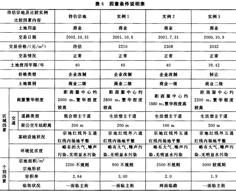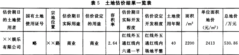 | 4.下面是一個完整的土地估價技術(shù)報告 (標注"略"的為正常內(nèi)容),請閱讀后指出錯誤并說明原因。每指出_處錯誤并簡述原因的得2分,只指出錯誤不簡述原因不得分,總分最高為50分;將正確內(nèi)容列為錯誤的每處扣0.5分,最多扣至本題為0分。(答題時,先在錯誤處標上號,如"①",然后在卷紙右邊空白處寫出對應(yīng)的簡述原因,如"①估價依據(jù)不完整") 土地估價技術(shù)報告(Ⅱ) 第一部分 總述 一、估價項目名稱 ××娛樂有限公司企業(yè)改制土地使用權(quán)價格評估(××市) 二、委托估價方(略) 三、受托估價方(略) 四、估價目的 該項評估是對××娛樂有限公司的土地進行土地使用權(quán)價格評估,其目的是為其企業(yè)改制辦理土地使用權(quán)出讓手續(xù)提供價格依據(jù)。 五、估價依據(jù) (一)國務(wù)院及有關(guān)部門頒布的法律、法規(guī) 1.《中華人民共和國土地管理法》; 2.《中華人民共和國城市房地產(chǎn)管理法》; 3.《中華人民共和國城鎮(zhèn)國有土地使用權(quán)出讓和轉(zhuǎn)讓暫行條例》; 4.《中華人民共和國土地管理法實施條例》; 5.《城鎮(zhèn)土地估價規(guī)程》。 (二)地方政府及有關(guān)部門頒布的法律、法規(guī)、通知文件 1.××省人民政府、××市人民政府頒布的有關(guān)政策、規(guī)定、實施辦法、通知等法規(guī)文件; 2.××國土資源廳、××市國土資源局制定的有關(guān)規(guī)定、文件等; 3.《××土地利用總體規(guī)劃》。 六、估價基準日 二00二年十月三十一日。 七、估價日期 二00二年十月十八日至二00二年十月三十一日。 八、地價定義 根據(jù)地價評估的技術(shù)規(guī)程和項目的具體要求,本次評估價格定義如下:估價對象在2002年10月31日,評估設(shè)定用途為商業(yè)用地,設(shè)定土地使用年限為40年,評估設(shè)定土地開發(fā)程度為宗地紅線外"五通"(即通路、通電、供水、排水、通訊)及紅線內(nèi)場地平整條件下的土地使用權(quán)價格。 九、估價結(jié)果 ××娛樂有限公司委托評估的一宗商業(yè)用地,土地面積2200㎡,在2002年10月31日,土地使用年限設(shè)定為40年,土地開發(fā)程度設(shè)定為宗地紅線外"五通"(即通路、通電、供水、排水、通訊)及宗地紅線內(nèi)"場地平整"條件下的土地價格如下所示。 單位地價:2413元/㎡。 總地價:530.86萬元。 大寫:伍佰叁拾萬捌仟陸佰元整。 (貨幣種類為人民幣,估價結(jié)果詳見表5)。 估價機構(gòu):××評估公司估價報告編號:(略) 估價期日:二00二年十月三十一日 (估價期日的土地使用權(quán)性質(zhì):劃撥) ![]() 1.上述土地估價結(jié)果的限定條件。 (1)土地權(quán)利限制:估價對象為國有土地,本次評估土地原為××娛樂有限公司使用的劃撥土地,××娛樂有限公司于××年×月領(lǐng)取《國有土地使用證》(證號略),使用權(quán)類型為劃撥,現(xiàn)公司進行企業(yè)改制,擬以出讓方式取得該宗地40年期土地使用權(quán)。 (2)基礎(chǔ)設(shè)施條件:紅線外五通(通路、通電、通上水、通下水、通訊),紅線內(nèi)場地平整。 地面平整狀況:地面平整。 周圍道路狀況:南臨××路。 供水狀況:市自來水公司供給。 排水狀況:雨污分流,人市政排水管網(wǎng)。 供電狀況:市政統(tǒng)一供電。 電訊狀況:電信線路覆蓋全區(qū)域。 供熱狀況:自備鍋爐,無市政統(tǒng)一供熱。 供氣狀況:無。 (3)規(guī)劃條件限制:略。 (4)影響土地使用權(quán)價格的其他限定條件:無特殊限制。 2.其他需要說明的事項:無。 十、需要特殊說明的事項 (一)估價的前提條件和假設(shè)條件 本報告估價結(jié)果在報告中設(shè)定的價格定義的界定條件下生效,如上述條件發(fā)生變化,則估價結(jié)果應(yīng)進行調(diào)整或重新評估。 (二)估價結(jié)果和估價報告的使用 1.本評估報告應(yīng)僅用于報告中所述的估價目的,不得作為它用,其內(nèi)容對第三方不負任何責(zé)任; 2.未經(jīng)評估單位書面同意,本評估報告的全部或任一部分不得用于公開的文件、通告或報告中,也不得以任何方式公開發(fā)表。 (三)需要說明的其他事項 1.技術(shù)報告由××公司負責(zé)解釋; 2.未經(jīng)對方許可,委托方及受托方均不得單獨對評估結(jié)果審核部門以外的部門或個人提供評估報告、技術(shù)報告及附件; 3.本評估報告由兩個及以上土地估價師簽字、估價機構(gòu)負責(zé)人簽字并加蓋公章后有效。 十一、土地估價師簽字 姓名估價師資格證書號估價師簽字(略) 十二、土地估價機構(gòu) 二00三年七月三十一日 第二部分 估價對象描述及地價影響因素分析 一、估價對象描述 1.土地登記狀況:待估宗地位于××路,其四至狀況為:略,待估宗地為國有土地,××娛樂有限公司于××年×月以劃撥方式取得該土地使用權(quán),《國有土地使用證》證號為:略,土地登記面積為2200㎡,登記用途為商業(yè)用地。 2.土地權(quán)利狀況:估價對象為國有土地,本次評估土地為××娛樂有限公司使用的劃撥土地,至評估基準日,委估宗地未設(shè)定抵押權(quán)、擔(dān)保權(quán)、地役權(quán)等他項權(quán)利。 3.土地利用狀況:勘估基準日,其《房屋所有權(quán)證》證號為××號,待估宗地內(nèi)建筑物為營業(yè)樓一棟,1973年建造,磚混結(jié)構(gòu),樓層為地上三層,地下一層,總建筑面積為5800㎡,現(xiàn)狀容積率2.