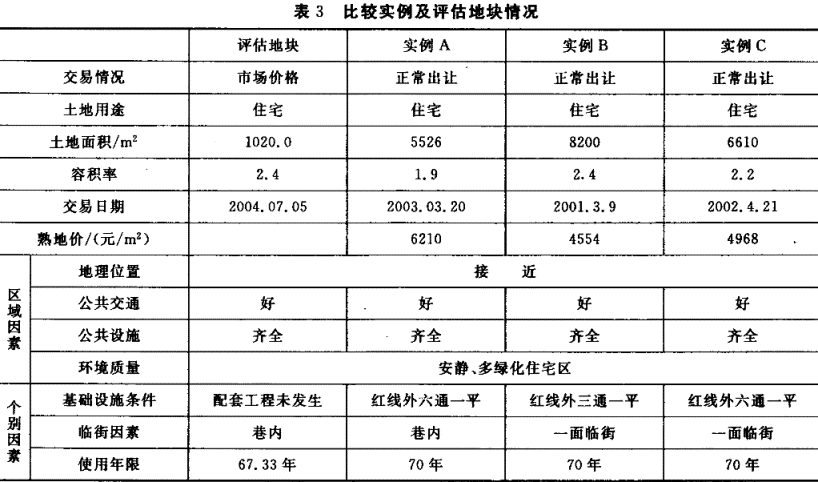 | 3.土地估價技術(shù)報告 第一部分 總述 一、估價項目名稱 ××房地產(chǎn)發(fā)展有限公司涉及法律訴訟的土地價格評估 二、委托估價方 ××市中級人民法院 三、受托估價方(略) 四、估價目的 根據(jù)××房地產(chǎn)發(fā)展有限公司提供的《國有土地使用證》,權(quán)利人為××房地產(chǎn)發(fā)展有限公司,已設(shè)定抵押權(quán),抵押權(quán)人為××銀行,因未能按期還款,估價對象土地已由××市中級人民法院查封?,F(xiàn)受委托評估土地的市場價格,供委托方確定拍賣價格提供參考;同時也為市國土資源局在辦理土地變更登記手續(xù)時,了解該土地交易價格是否合理提供決策依據(jù)。 五、估價依據(jù) 1.《中華人民共和國土地管理法》及實施條例。 2.《中華人民共和國城市房地產(chǎn)管理法》。 3.《中華人民共和國城鎮(zhèn)國有土地使用權(quán)出讓和轉(zhuǎn)讓暫行條例》。 4.《城鎮(zhèn)土地估價規(guī)程》。 5.《城鎮(zhèn)土地分等定級規(guī)程》。 6.委托方及案件當事人提供的有關(guān)資料。 7.委托評估函。 8.《國有土地使用證》[××字(1998)第×××××號]。 9.《國有土地使用權(quán)出讓合同》[××土地出讓合同字第×××號]。 10.《關(guān)于××商品住宅項目可行性研究報告的批復》[××計投××號]。 11.《建設(shè)用地規(guī)劃許可證》[××規(guī)地×第×××號]。 12.其他有關(guān)資料。 13.估價人員實地勘察、調(diào)查資料。 六、估價基準日 2004年7月5日 七、估價日期 2004年7月5日至7月14日 八、地價定義 本報告提供的土地價格是2004年7月5日住宅用地使用權(quán)市場價格。 九、估價結(jié)果 經(jīng)評估,待估宗地于估價基準日在現(xiàn)狀條件下67年4個月使用期限的土地使用權(quán)價格如下。 土地單價:4562元/㎡??們r:10237128元。 大寫:壹仟零貳拾叁萬柒仟壹佰貳拾捌元整(人民幣元) 十、需要特殊說明的事項 1.本估價報告提供的評估結(jié)果是在全部限制條件下于估價期日的公開市場價值,所謂公開市場價值指評估對象于估價基準日,在市場上出售并按以下條件可取得的合理價格: (1)買賣雙方不因任何特殊利益抬高或降低土地真實價值; (2)有一段合理交易時間; (3)在此期間土地市場應保持穩(wěn)定; (4)房地產(chǎn)買賣程序應符合國家法律規(guī)定。 2.由于待估宗地的土地權(quán)屬性質(zhì)為國有劃撥,考慮到未來轉(zhuǎn)讓土地的需要,本評估價格中包括土地使用權(quán)出讓金;根據(jù)國家規(guī)定,該劃撥土地轉(zhuǎn)讓時,應交納土地出讓金。 3.本報告的評估價格系全部限制條件下求得的。根據(jù)××房地產(chǎn)發(fā)展有限公司提供的《國有土地使用證》,該土地已設(shè)定抵押權(quán),因抵押人未能按期還款,該土地已由××市中級人民法院查封。考慮到本次評估是為法院處置該土地提供價格依據(jù),所以未考慮抵押權(quán)對價格的影響。 4.本報告自估價基準日起一年內(nèi)有效。 十一、土地估價師簽字 姓名 土地估價師資格證書號 簽字 王** **** (簽字) 李** **** (簽字) 十二、土地估價機構(gòu)(章) 二00四年七月十四日 第二部分 估價對象描述及地價影響因素分析 一、估價對象描述 1.土地登記狀況。 根據(jù)××房地產(chǎn)發(fā)展有限公司提供的<國有土地使用證》,該土地所有權(quán)屬于國家所有,土地使用權(quán)人為××房地產(chǎn)發(fā)展有限公司,土地權(quán)屬性質(zhì)為國有出讓。該宗地已設(shè)定抵押權(quán),抵押權(quán)人為××銀行,因未能按期還款,估價對象土地已由××市中級人民法院查封。 估價對象土地為國有出讓土地使用權(quán),土地使用期限為2001年11月19日至2072年11月18日,自評估基準日起還剩余67年4個月。 2.土地權(quán)利狀況。 根據(jù)××房地產(chǎn)發(fā)展有限公司提供的國有土地使用權(quán)證,估價對象宗地編號為××××,圖號為××××,地號為××××,規(guī)劃用途為住宅用地,土地總面積為1020.0㎡,處于基準地價三級區(qū)域。國有土地使用證號:××××××號。 3.土地利用狀況。 (1)規(guī)劃指標:根據(jù)土地使用權(quán)出讓合同,項目批準建造四層公寓式商品住宅二幢,總建筑面積2244㎡。 (2)地塊目前尚未開發(fā),除沿××路還有三戶待拆遷房屋外,其余已于2002年9月拆平。 二、地價影響因素分析 1.一般因素。 (略) 2.區(qū)域因素。 估價對象地塊周邊公交線路多,交通方便,距市中心直線距離約4km,四周多為二層或多層住宅,幼托、小學、商店、郵局、銀行等公共設(shè)施齊全,人均公共綠化面積大,為該城市低密度居住區(qū)。 3.個別因素。 評估地塊基本規(guī)則,面積小,土地開發(fā)工程建設(shè)所需的水、電尚未接通。 第三部分 土地估價 一、估價原則 本項目評估遵循土地估價的合法原則、公平公正原則、估價時點原則、供求原則。 二、估價方法和估價過程 由于估價對象位于城市低密度居住區(qū),房地產(chǎn)市場和土地市場比較發(fā)達,有較多的成交實例可以選擇,根據(jù)《城鎮(zhèn)土地估價規(guī)程》(以下簡稱《規(guī)程》)并結(jié)合估價對象的具體特點,選擇市場比較法及成本逼近法進行評估。 (一)市場比較法 根據(jù)替代原則,將估價對象土地與較近時期內(nèi)已經(jīng)發(fā)生交易的類似土地實例,進行對照比較,并依據(jù)后者已知的價格,參照該土地