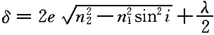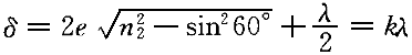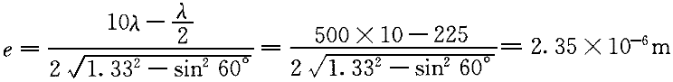 | 1.用波長為500nm的入射光照射在厚度均勻的透明塑料薄膜上,在反射角60°的位置上看到第10級干涉明條紋,薄膜折射率n=1.33,則薄膜的厚度是( )。 |