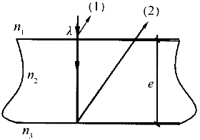 4.如圖所示,折射率為n 、厚度為e的透明介質(zhì)薄膜的上方和下方的透明介質(zhì)的折射率分別為n 和n ,已知n <n <n 。若用波長(zhǎng)為λ的單色平行光垂直入射到該薄膜上,則從薄膜上、下兩表面反射的光束(1)和(2)的光程差是( )。 |