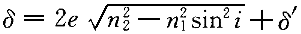正確答案:A 解題思路:【解析】由從薄膜上、下兩表面反射的光束(1)和(2)的光程差是δ=2n e![]() 【點(diǎn)評(píng)】薄膜干涉光程差的公式為: ![]() 上式中i為單色平行光入射到薄膜的入射角,e為介質(zhì)薄膜厚度。n 、n 、n 分別為薄膜的上方、薄膜、薄膜下方介質(zhì)的折射率,δ′為半波損失項(xiàng),或叫附加光程差。當(dāng)單色平行光垂直入射到薄膜上,入射角i=0,則從薄膜上、下兩表面反射的光束(1)和(2)的光程差是:δ=2en +δ′半波損失項(xiàng)δ′的判定是正確做題的關(guān)鍵。式中附加光程差δ′的討論是非常有意義的,在實(shí)際計(jì)算中也是非常重要的。δ′是這樣確定的:(1)光只發(fā)生了一次反射,是在上表面即由介質(zhì)(n )入射到薄膜表面的反射,有半波損失;(2)光也有一次反射,是在下表面即由薄膜入射到介質(zhì)(n )表面的反射,沒有半波損失;故總共只有一個(gè)半波損失,即δ′=λ/2(或?qū)憺?delta;′=-λ/2,兩種寫法不影響明暗條紋的位置)。若都有半波損失或都沒有半波損失,則δ′=0。更一般地講,薄膜干涉可能涉及三種不同的介質(zhì)n 、n 和 ,從介質(zhì)的折射率大小的排列來(lái)看,有兩種可能的方式。一種是按n >n <n 或n <n >n 的順序排列,即薄膜的折射率大于或小于它兩面介質(zhì)的折射率。此時(shí)對(duì)反射光干涉δ′=λ/2,另一種是n > >n 或n <n <n 的排列順序,即薄膜折射率的大小,在它兩面的介質(zhì)折射率的大小之間。例如水面上的油膜,鏡頭上的保護(hù)膜都屬于這種情況。這時(shí)對(duì)反射光干涉附加光程差為δ′=0。 |
