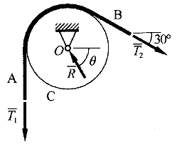 繩索AB繞過園滑輪C,輪軸O通過滑輪中心且與滑輪光滑接觸,繩索及滑輪重量不計。![]() |
