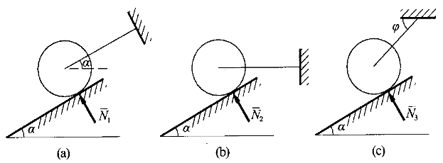 2.自重為 的小球在繩索和光滑斜面的約束下處于靜止,分析圖示三種情況下斜面對小球的支持力 的大小,經對比,他們之間的關系應是( )。![]() |