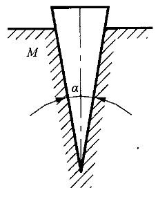 4.用鋼楔劈物,接觸面間的摩擦角為φ ,鋼楔重力不計。劈入后欲使鋼楔不滑出,鋼楔兩個平面的夾角α應為( )。![]() |