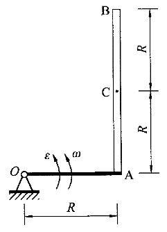 圖示直角剛性彎桿OAB由OA和AB桿固結而成,均質桿AB的質量為m,桿OA的質量不計。圖示瞬時剛性彎桿繞O軸轉動的角速度為ω,角加速度為ε。![]() |