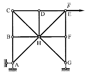 | 正確答案:D 解題思路:根據節點平衡的特殊情況,可依次判斷出結構中BH、DH、FH、GH、CH、CB、BA、CD、DE均為零桿。 |