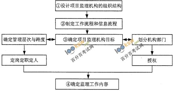 確定項目監理機構目標(0.5分)→確定監理工作內容(0.5分)→設計項目監理機構的組織結構(0.5分)→制定工作流程和信息流程(0.5分)。