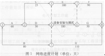 6. 某水電站工程項目,業主通過招標與甲建筑公司簽訂了土建工程施工合同,包括A、B、C、D、E、F、G、H八項工作,合同工期360天。業主與乙安裝公司簽訂了設備安裝施工合同,包括設備安裝與調試工作,合同工期180天。通過相互的協調,編制了如圖1所示的網絡進度計劃: