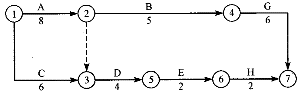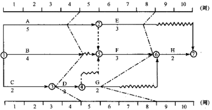 7.某分部工程時標網絡計劃下圖所示,當設計執行到第4周末及第8周末時,檢查實際進度如圖中前鋒線所示,該圖表明( )。![]() |
