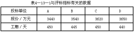 | 正確答案: 1.(1)本案例所列招標工作先后順序不妥當。 (2)正確的順序應為:①成立招標工作小組;②編制招標文件;③編制標底;④發(fā)布招標公告;⑤投標單位資格審查;⑥發(fā)放招標文件;⑦組織現(xiàn)場踏勘和招標答疑;⑧接收投標文件;⑨開標;⑩評標; 確定中標單位; 發(fā)出中標通知書; 簽訂承發(fā)包合同。2.A、B、C、D四家投標單位的報價得分計算如下: (1)A單位報價降低率:(3440-3600)/3600=-4.44%。 由于A單位報價降低率超過-4%,所以A為廢標。 (2)B單位報價降低率:(3540-3600)/3600=-1.67%<4%; B單位報價上升率為:(3540-3600×96%)/(3600×96%)×100%=2.43%; B單位報價得分=100-3×3=91(分)。 (3)C單位報價降低率(3620-3600)/3600=0.56%<4%; C單位報價上升率為(3620-3600×96%)/(3600×96%)×100%=4.75%; C單位報價得分=100-3×5=85(分)。 (4)D單位報價降低率(3650-3600)/3600=1.39%<4%; D單位報價上升率為(3650-3600×96%)/(3600×96%)×100%=5.61%; D單位報價得分=100-3×6=82(分)。 各項指標得分及總得分表如表4-13-3所示。 ![]() 根據(jù)總得分最高者中標的原則,應確定中標單位為B單位。 |