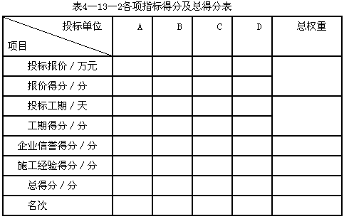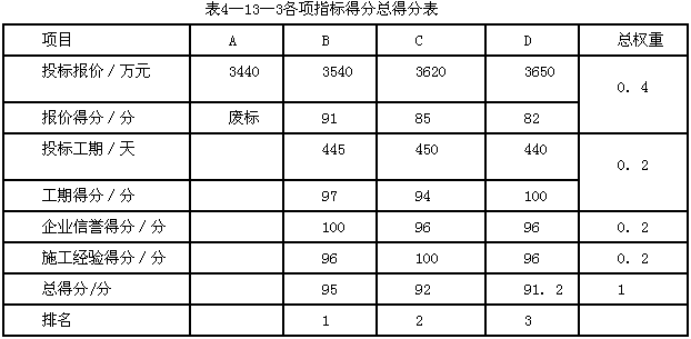 | 1.某綜合樓工程項目的施工,經(jīng)當?shù)刂鞴懿块T批準后,由建設(shè)單位自行組織公開招標。 招標工作主要內(nèi)容確定為:①成立招標工作小組;②發(fā)放招標文件;③發(fā)布招標公告;④編制標底;⑤編制招標文件;⑥投標單位資格審查;⑦組織現(xiàn)場踏勘和招標答疑;⑧開標;⑨確定中標單位;⑩接收投標文件; 評標; 簽訂承發(fā)包合同; 發(fā)出中標通知書。現(xiàn)有A、B、C、D四家施工企業(yè),經(jīng)資格審查合格,參加該工程的投標。與評標指標有關(guān)的數(shù)據(jù)如表4-13-1所示。 ![]() 經(jīng)招標工作小組確定的評標指標及評分方法為: (1)投標報價以標底價(3600萬元)的±4%以內(nèi)為有效標。評分方法是:報價以標底價減去其4%為100分,在標底價減去其4%的基礎(chǔ)上,每上升1%扣3分,不足1%的按1%計算; (2)定額工期為500天。評分方法是:工期提前60天為100分,在此基礎(chǔ)上每拖后5天扣3分; (3)企業(yè)信譽和施工經(jīng)驗均已在資格審查時評定。 企業(yè)信譽得分:B單位為100分,A、C、D單位均為96分;施工經(jīng)驗得分:A、C單位為100分,B、D單位為96分。 (4)上述四項評標指標的總權(quán)重分別為:投標報價40%;投標工期、企業(yè)信譽和施工經(jīng)驗均為20%。 【問題】 1.如果將上述招標工作內(nèi)容的順序作為招標工作先后順序是否妥當?如果不妥,請給出合理的順序。 2.試在表4-13-2中填制每個投標單位各項指標得分及總得分,其中報價得分要求列出計算式并根據(jù)總得分列出名次,確定中標單位。 ![]() |