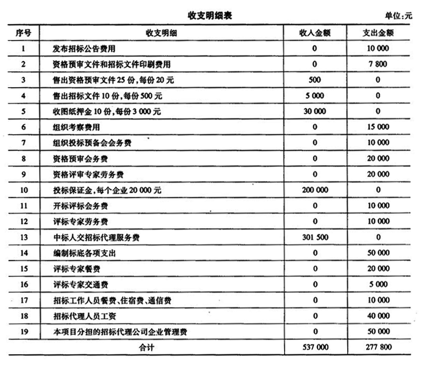 | 正確答案: (1)按取費標準,該項目的代理服務費為301500元,下浮10%后為271350元。 (2)表中計算的項目凈收益259200元是錯誤的,因為圖紙押金和投標保證金是需要退還的資金,不能計入收入;招標工作人員餐費、住宿費、通信費等已計入代理公司企業管理費,不能再計入支出。因此應從表中扣除這些支出與收入;另外代理服務費為標準下浮10%,應調整為271350元,計算表見下表。該公司的凈收益為276850-267800=9050元。 ![]() ![]() |
