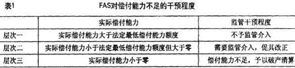 償付能力監管是英國壽險公司風險監管的重點和核心內容,FAS對償付能力不足的干涉程度見表1。