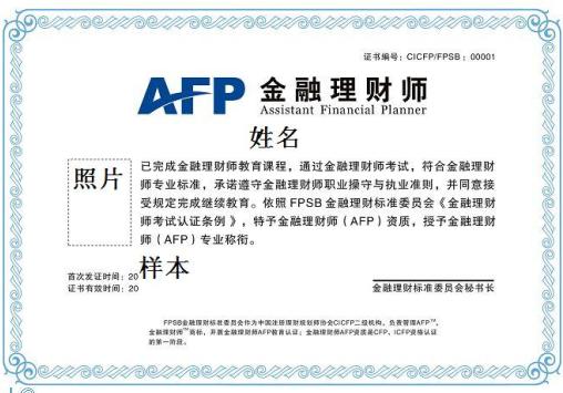 AFP金融理財師認證證書必須經考試取得,考試為全國統一考試,每年四次,分別為1月、4月、7月、11月第三個周末,通過的AFP金融理財師考試, CICFP金融理財標準委員會頒發《AFP金融理財師》資質證書。持證人可以在從事金融理財業務、宣傳、名片中使用AFP商標和標識。