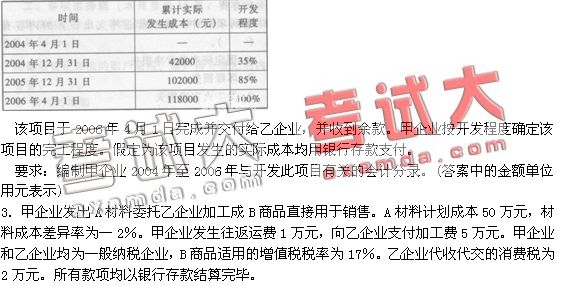 2.甲企業自2004年4月1日起為乙企業開發一項系統軟件。合同約定,工期為兩年,合同總收入為200000元,2004年4月1日乙企業支付項目價款40000元,2004年12月31日乙企業支付項目價款50000元,2005年12月31日乙企業支付項目價款60000元,余款于軟件開發完成時收取。甲企業已按合同約定收到乙企業各期支付的該項目的價款,并存入銀行。該項目預計總成本為120000元。其他相關資料如下: