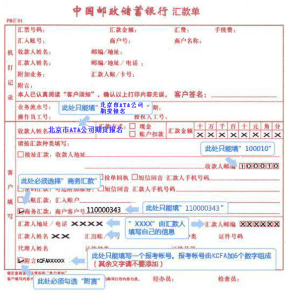 (郵編:100010,收款人:北京市ATA公司期貨報名,匯款方式:商務(wù)匯款,商戶客戶號:110000343)