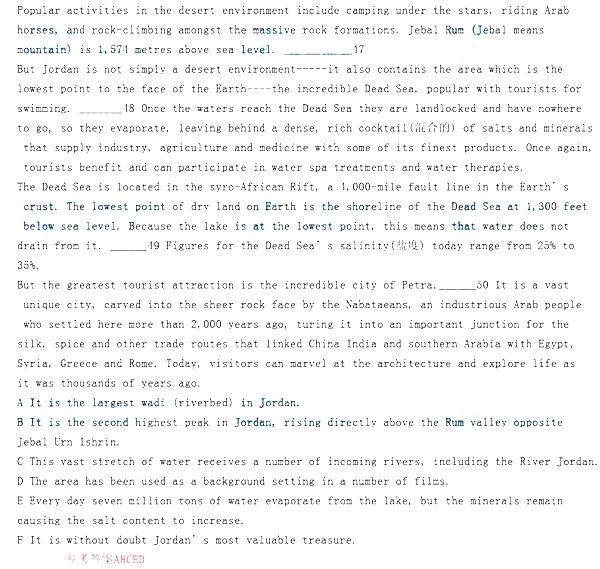 Explore Jordan Wadi Rum is the name given to a valley cut into the sandstone and hard rock in southwest Jordan. _______________46 The name Rum most likely comes from an Aramaic word meaning “high” or “elevated”, The area around Wadi Rum is now also one of Jordan’s most important tourist destinations, and attracts an increasing number of foreign tourists, particularly trekkers(越野者),but also for camel safaris(旅行) or simply day-trippers from Aqaba or Petra. In contrast, there are almost no local or Arab tourists through nearby disi attracts young people from Amman at the weekends.