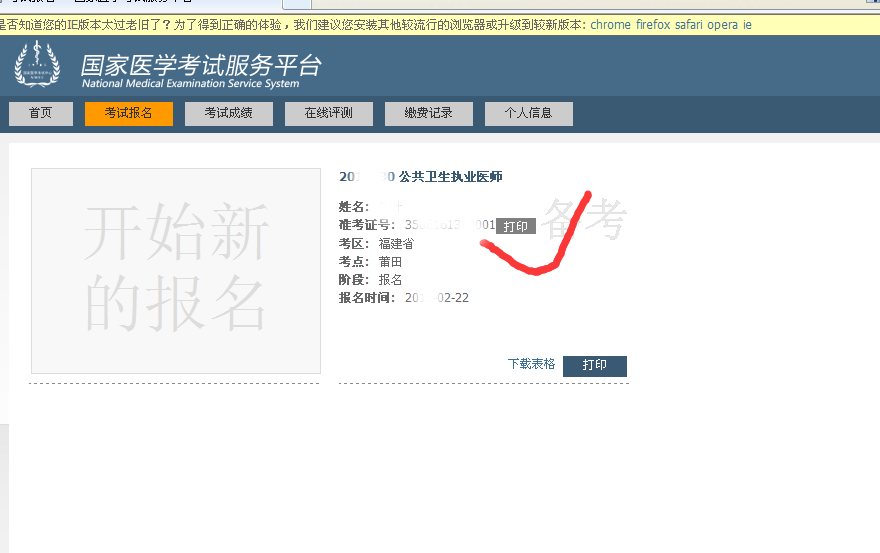 (四)成功登錄后,進入“考試報名”界面,點擊準考證號右側的“打印”鏈接即可打印。