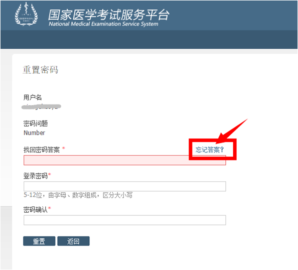 一、登錄國家醫學考試網(www.nmec.org.cn),點擊“成績查詢”,在國家醫學考試服務平臺登錄界面,點擊“忘記密碼”鏈接,正確填寫密碼答案后,可重置密碼。