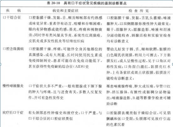 具有口干癥狀常見疾病的鑒別診斷要點見表20-l0.