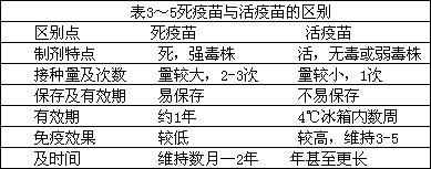 (2) 減毒活疫苗:用減毒或無毒力的活的病原微生物制成 ( 特點:無毒性或毒力減弱,保留增殖能力和免疫原性 ) 。死疫苗與活疫苗的區別見表 3 ~ 5 。