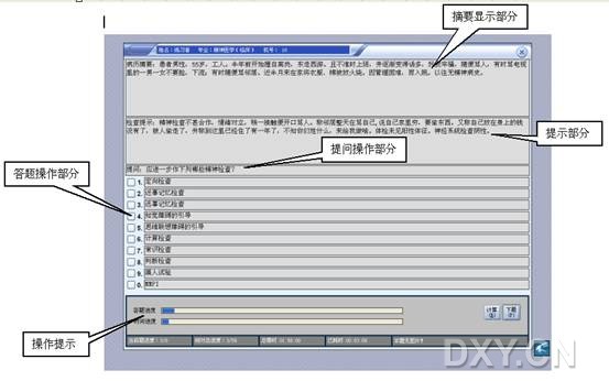 (1)摘要顯示部分:摘要顯示位于屏幕上部,一般用于顯示所考案例描述性文字,如同臨床醫學題型為“病例摘要”,摘要在本案例的提問沒有結束之前始終存在,以便隨時為考生提供信息。當下一案例題出現時其自動消失。