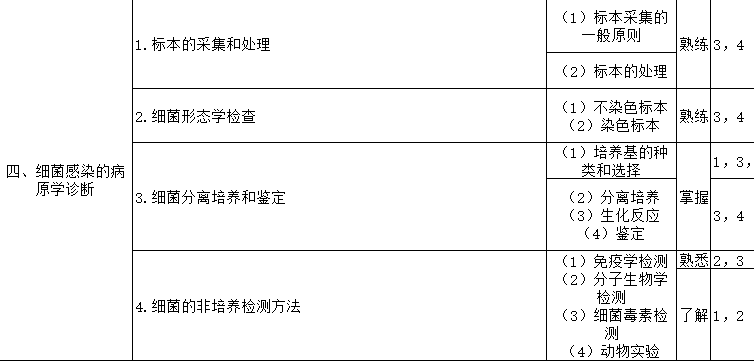 | 三十九、臨床微生物學檢驗標本的采集 | 血液、腦脊液、膿液、痰液、糞便、尿液、生殖道標本 | (1)標本采集 | 掌握 | 3,4 |