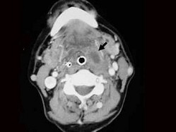 | 患者,女性,28歲,發熱頭痛4天,伴咽旁和頸部劇痛,吞咽困難,吐字不清,查體:扁桃體及咽側壁突向咽腔,但無明顯充血,張口困難,牙關緊閉: |