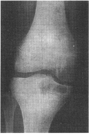4.男,17歲。右膝關(guān)節(jié)疼痛1個月余,輕度腫脹。X線片示脛骨近端圓形骨質(zhì)破壞(如圖),應(yīng)考慮的診斷是![]() |