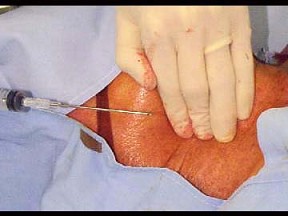 | 患者男性,28歲。三小時前經(jīng)右側(cè)頸內(nèi)靜脈放置中心靜脈導(dǎo)管,現(xiàn)在出現(xiàn)呼吸困難,血壓80/69mmHg,HR130次/分,脈細,聽診心音遙遠,檢查口唇明顯發(fā)紺、頸靜脈怒張。 |