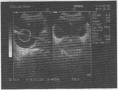 | 正確答案:D 解題思路:膀胱內見無回聲暗區,周邊有高回聲包膜(氣囊導尿管回聲)。 |
