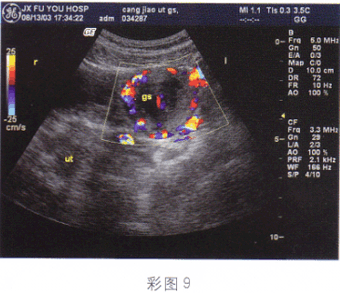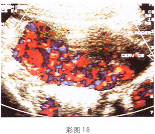 女性,36歲,停經約3個月,不規則陰道出血半月余。查體:子宮體積大于停經周數,子宮旁觸及囊性腫塊,血HCG1260μg/ml。超聲表現見彩圖18。