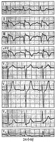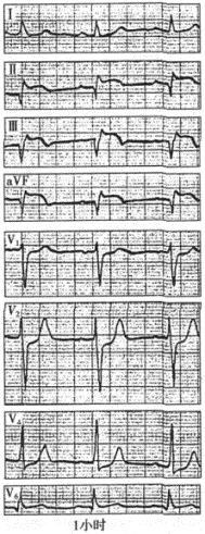 患者男性,49歲,發作性胸骨后疼痛2天,含硝酸甘油可緩解,1小時前再發胸痛伴大汗,含硝酸甘油不能緩解就診,急查心電圖示V ~V 導聯ST段抬高0.5~0.8mV,呈單向曲線,未見壞死型Q波。 |