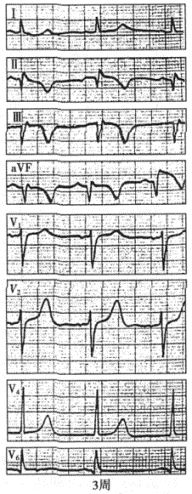 5.患者男性,62歲,冠心病。因突發胸痛不能緩解就診,下圖系患者胸痛發作后1小時、24小時及3周的心電圖記錄,應診斷為![]() ![]() ![]() |