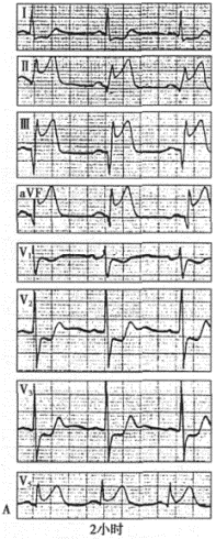 4.患者男性,47歲,因突發胸痛2小時就診。下圖A、B、C系患者胸痛發作后2小時、24小時及11周的心電圖記錄,應診斷為![]() ![]() ![]() |
