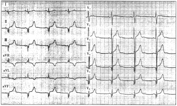患者男性,35歲,因胸痛、咳嗽2天就診,急查心電圖如下圖所示。心肌壞死標志物正常,超聲心動圖提示少許心包積液,臨床診斷為急性心包炎。![]() |