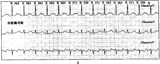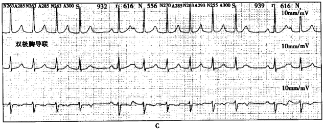 男性,33歲,心悸1周就診。動態心電圖檢查如下圖A、B、C所示。![]() ![]() ![]() |