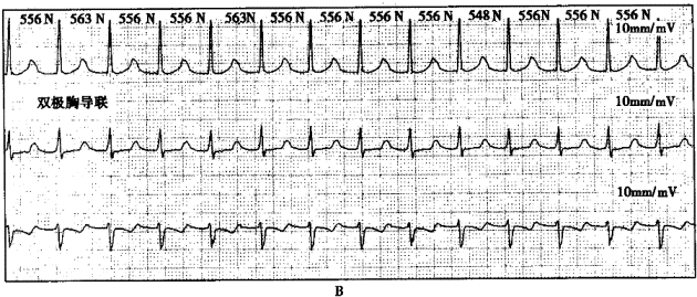 | 正確答案:B 解題思路:竇性P波大多規律出現,但僅少數P波下傳心室,部分P波消失(隱藏在QRS波群中)或落人QRS波群之后。QRS波群形態正常,當心室率>心房率時,非陣發性交界性心動過速與竇性心律之間形成干擾性房室分離,應注意與病理性房室傳導阻滯相鑒別。 |