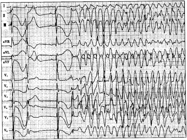 | 正確答案:C 解題思路:圖中第1、3個心搏為逸搏心律,顯示QT間期明顯延長;第4個心搏(室性期前收縮)落在T波上并誘發了1陣多形性室性心動過速。其特點為:心室率較快,約為200次/分;QRS波群寬大畸形,形態不恒定,圍繞基線不斷扭轉其主波方向。應診斷為QT間期延長,尖端扭轉型室性心動過速。 |