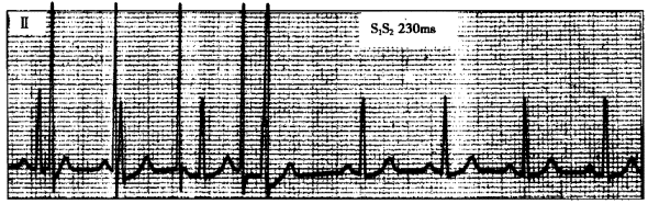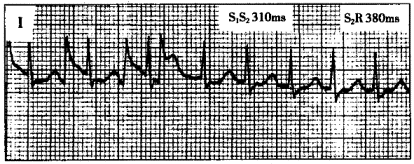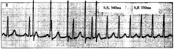 患者男性,18歲,反復(fù)發(fā)作心悸5年。食管心房調(diào)搏檢查記錄到圖4-7-8和圖4-7-9。![]() ![]() ![]() ![]() |