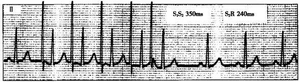 正確答案:8.D;9.A;10.A 解題思路:如下圖中,當(dāng)S1S2間期為320ms時,S2R間期為280ms;S S 間期為310ms時,S R間期為380ms,即S R間期跳躍延長100ms,并誘發(fā)出室上性心動過速,表明激動遇到了快徑路不應(yīng)期而從慢徑路下傳,即存在房室結(jié)雙徑路。如下圖中的食管導(dǎo)聯(lián)心電圖(ESO)顯示心動過速發(fā)作時,RP′間期<P′R間期,RP′間期(70ms,提示為慢快型房室結(jié)折返性心動過速。![]() ![]() |