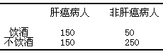 | 4.選擇300例肝癌患者和300例對照進行飲酒與肝癌關系的病例對照研究,調查發現300例患者中有150人飲酒,300例對照中有50人飲酒,肝癌與飲酒的相對危險度是 |